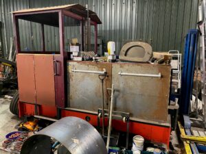 This Loco Simplex 20/28 ESK Works No. MR7498 built 1940 – ex Bolton Fell. The engine is a diesel 3 cylinder Deutz air cooled, electric start. New drive chain and sprockets, retyred, new brake blocks, Chassis extended front and rear – new redesigned cab with glazing front and rear. Cab floor and gear change mechanism needs to be built.