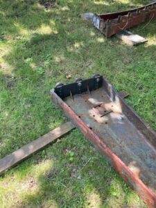 Work continues and we have now moved one of the main stair platforms into the workshop. One of the columns had a repair “plate” bolted in position at the base and when we took this plate off a section of the casting has broken away. When removed we discovered the columns are open at the bottom with a weep hole to allow any water getting in to escape. The issue seems to have been that the weep hole was below ground level and had been blocked with concrete. We suspect water ingress into this column then froze causing the casting to crack. All of this was probably at least 75 years ago as the repair was certainly not recent and the ¼ plate was down to a few mm in places. This has now been cleared of debris, note the remnants of the bolts inside.