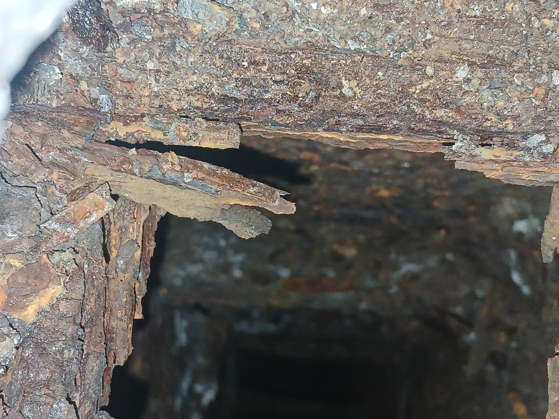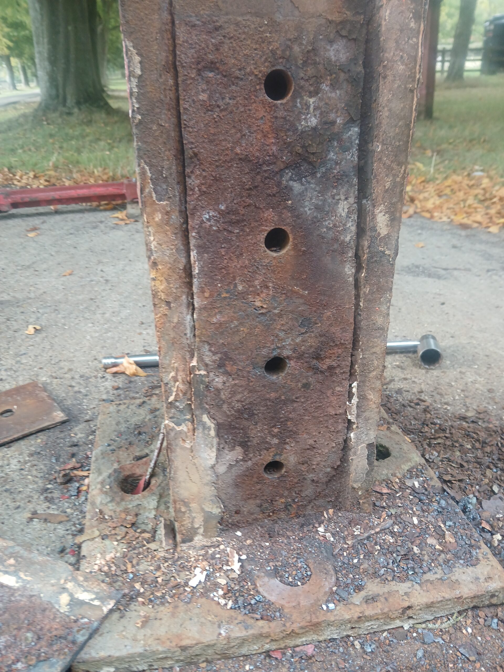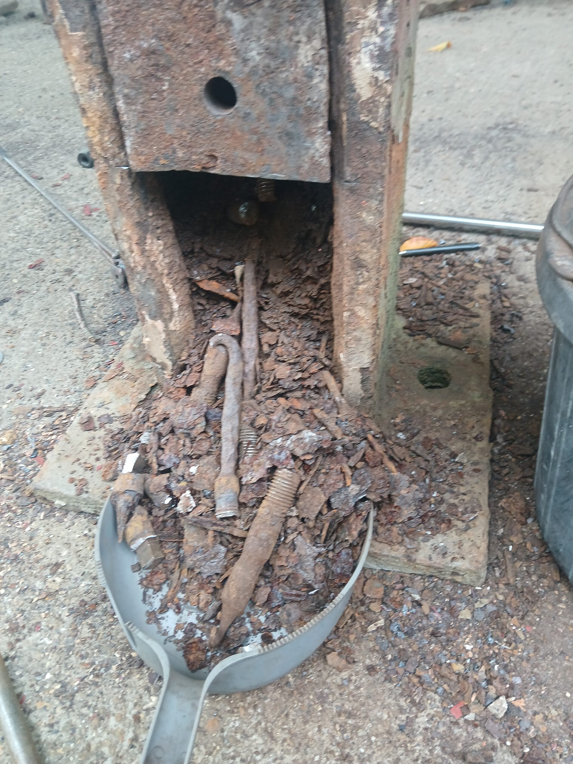 We removed the guard rail posts from the top of the stair platform so we could inspect inside. Previous bolts were found to be seriously deteriorated. These were a whole new level. The bolts shown at the top of the column look fine on the outside. Now see inside the column – difficult to make out a bolt at all. Then we removed the head – that is all there was.