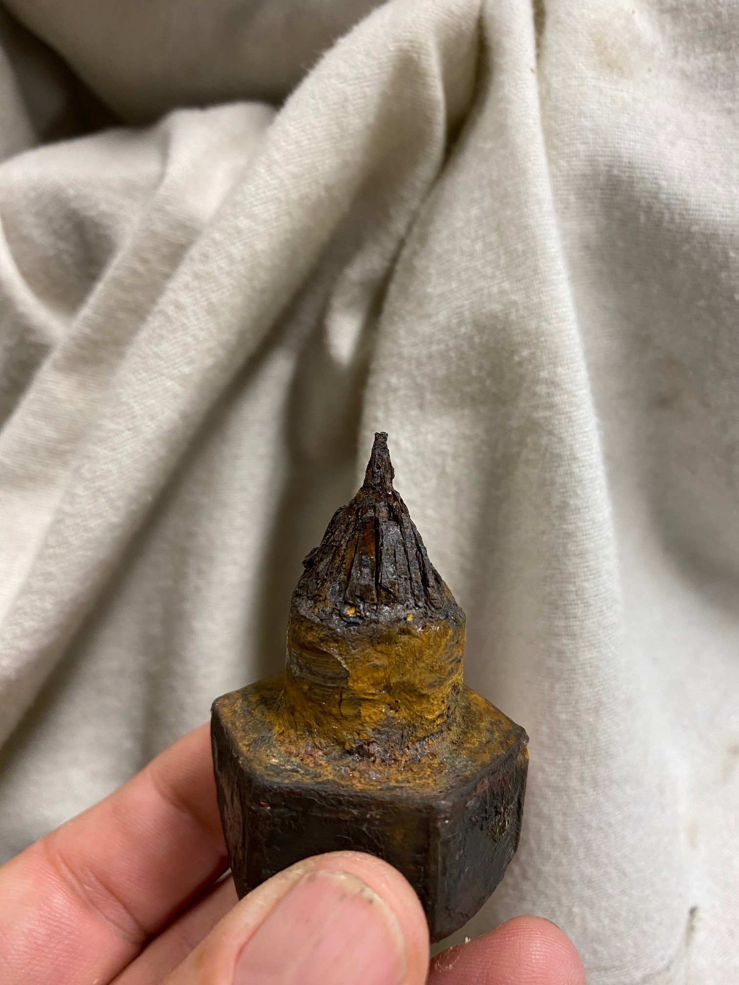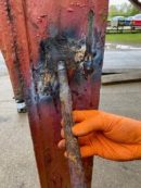Work on the bridge is slow as we have found it to be in a much worse condition than initially thought. We removed the guard rail posts from the top of the stair platform so we could inspect inside. Previous bolts were found to be seriously deteriorated. These were a whole new level. The bolts shown at the top of the column look fine on the outside. Now see inside the column – difficult to make out a bolt at all. Then we removed the head – that is all there was.