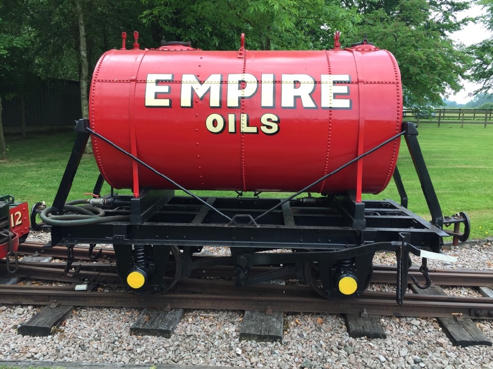Painted in the bright red livery of Empire Oils this wagon was constructed on a MoD underframe.