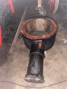 We have now removed all the tubes in this portable engine. The new tubes are on order (thanks to a donation to cover the cost – you know who you are – much appreciated). We don’t expect them to be delivered until January so work will progress after the Christmas events to have the boiler ready for the tube installation when they do arrive. In the meantime the metal covers have been shot blasted courtesy of McNealy Brown in Sittingbourne. Their wheel refurbishment and powder coating division, have been really supportive in helping us. Photo left of the smokebox end plate being prepared to receive the new tubes and onthe removed smoke box and chimney,