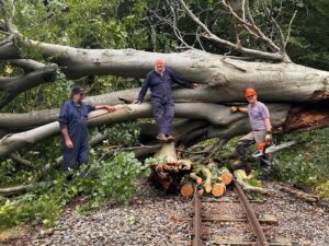We frequently inspect the line for obstructions and potential danger.  One rather nice beach tree close to the line looked perfectly healthy however, on 21st September in perfectly still, dry conditions. with an audience of a large private party it decided to shed a very large bow.  It crashed down over the line.  Detailed inspection showed the bow to be rotten at the junction with the main trunk – impossible to see or predict.  With the bow down we could see inside the trunk and concluded the rest of the tree could not be trusted!  The following day our three intrepid hunters felled the main tree.  It’s taken several weeks and help from many volunteers to clear up.  Large piles of wood still lie by the track.  On the upside, we now have enough wood for the locomotives for next year!